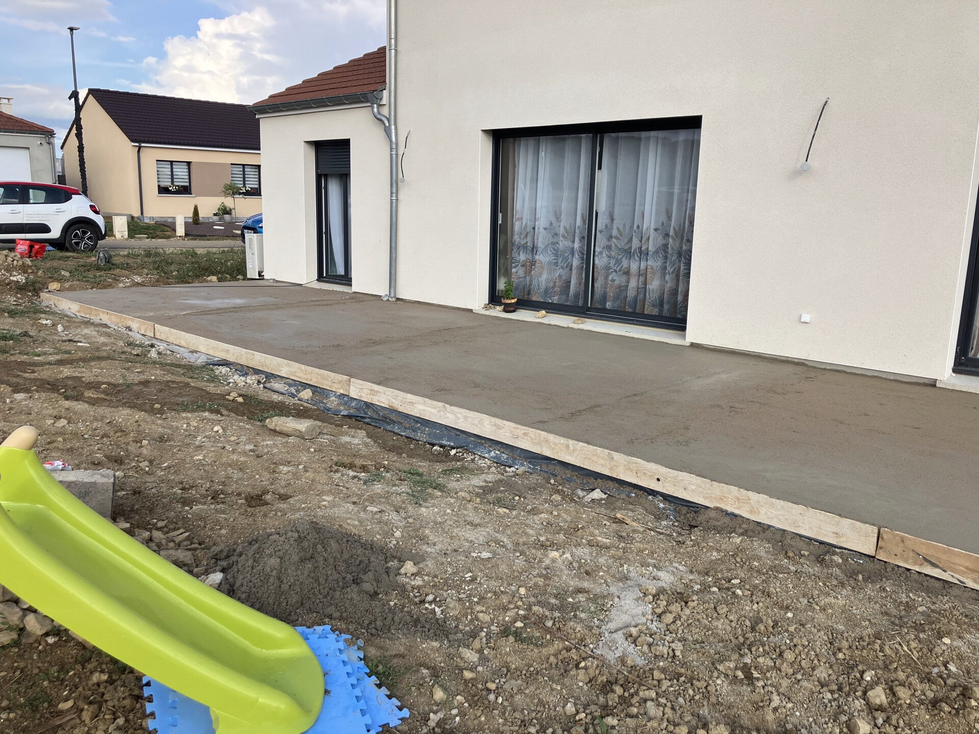 Méthode traditionnelle de construction de dalles en terre plein, incluant un terrassement si nécessaire, suivi de la mise en place d'une chape, si besoin, pour accueillir un revêtement.